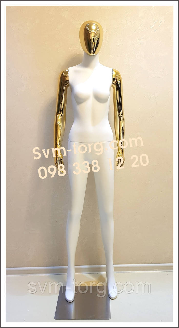 Показати оптові ціниЖіночий манекен матовий білий. Обличчя золота маска. Золоті руки.